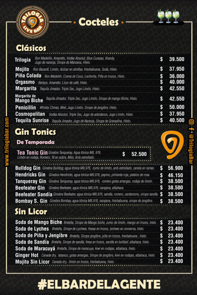 - viernes y sábados toca el Grupo Trilogía, música variada. Otros días programamos eventos especiales en preventa en trilogiabar.com